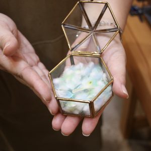 私は鳥を飼っていなかったので、今回の6人展の出展者でもあるcocoroさん(INTERVIEW |リサイクルガラス の魅力を体験を通して伝えていく ガラス作家・岩月直美)が飼っているセキセイインコの羽をお友達作家さんが繋いでくださって、実現しました。